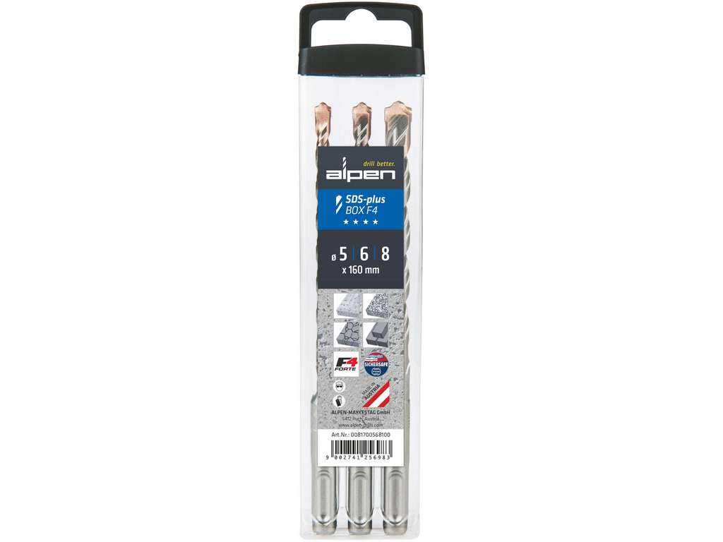 Le foret pour marteau perforateur SDS-plus F4 avec profil à 4 étapes breveté et plaque en carbure brevetée. Faible usure, très longue durée de vie. Foret haute performance pour le perçage à percussion dans le béton, la pierre naturelle et la maçonnerie.