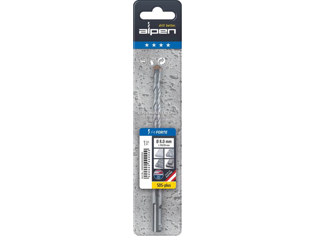 Le foret pour marteau perforateur SDS-plus F4 avec profil à 4 étapes breveté et plaque en carbure brevetée. Faible usure, très longue durée de vie. Foret haute performance pour le perçage à percussion dans le béton, la pierre naturelle et la maçonnerie.