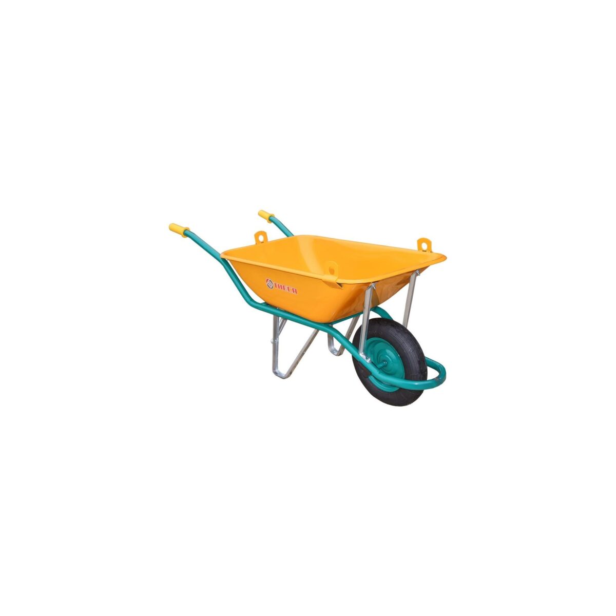 Brouette peinte THECA 90 L, particulièrement adaptée au domaine de la construction grâce à ses crochets pour grue en option.