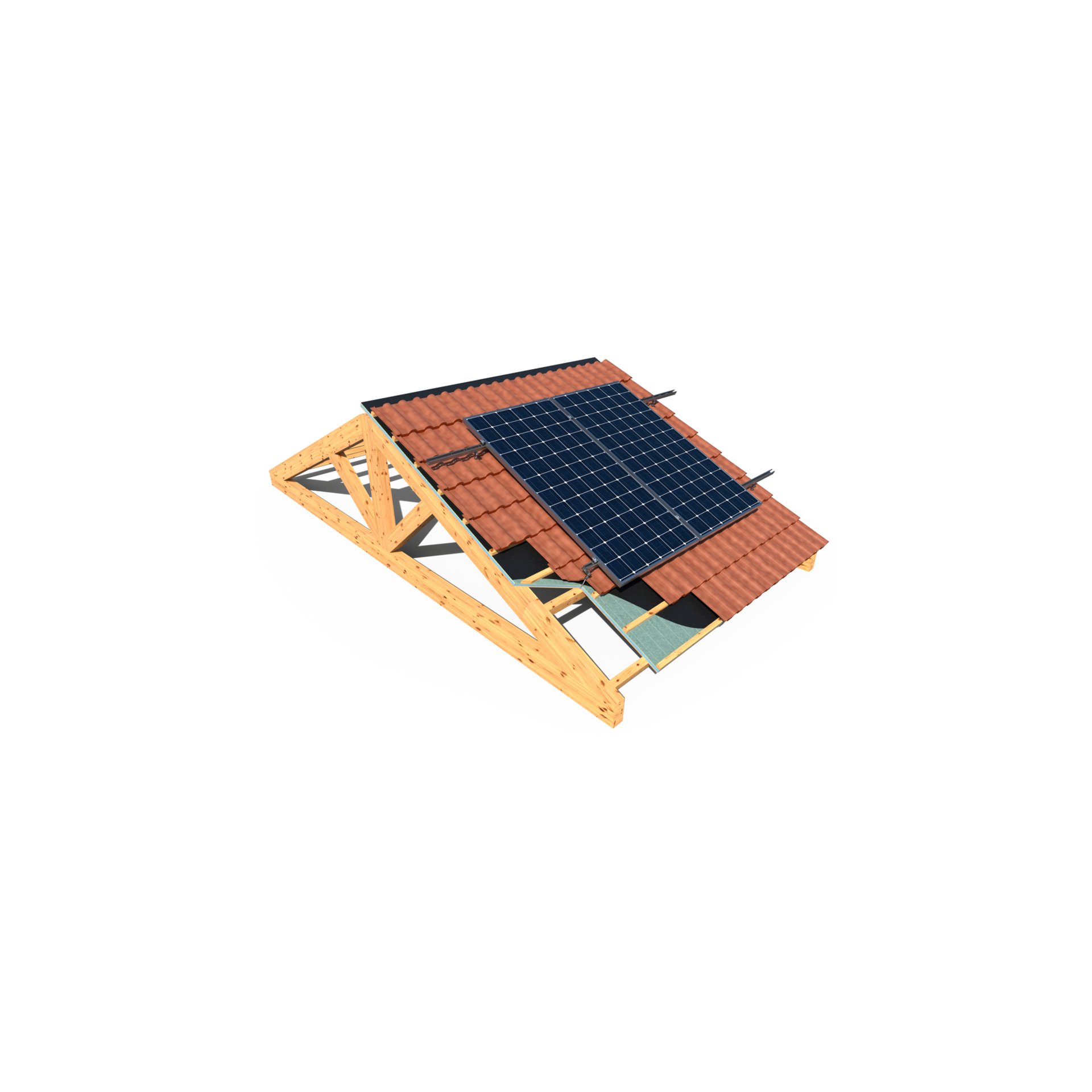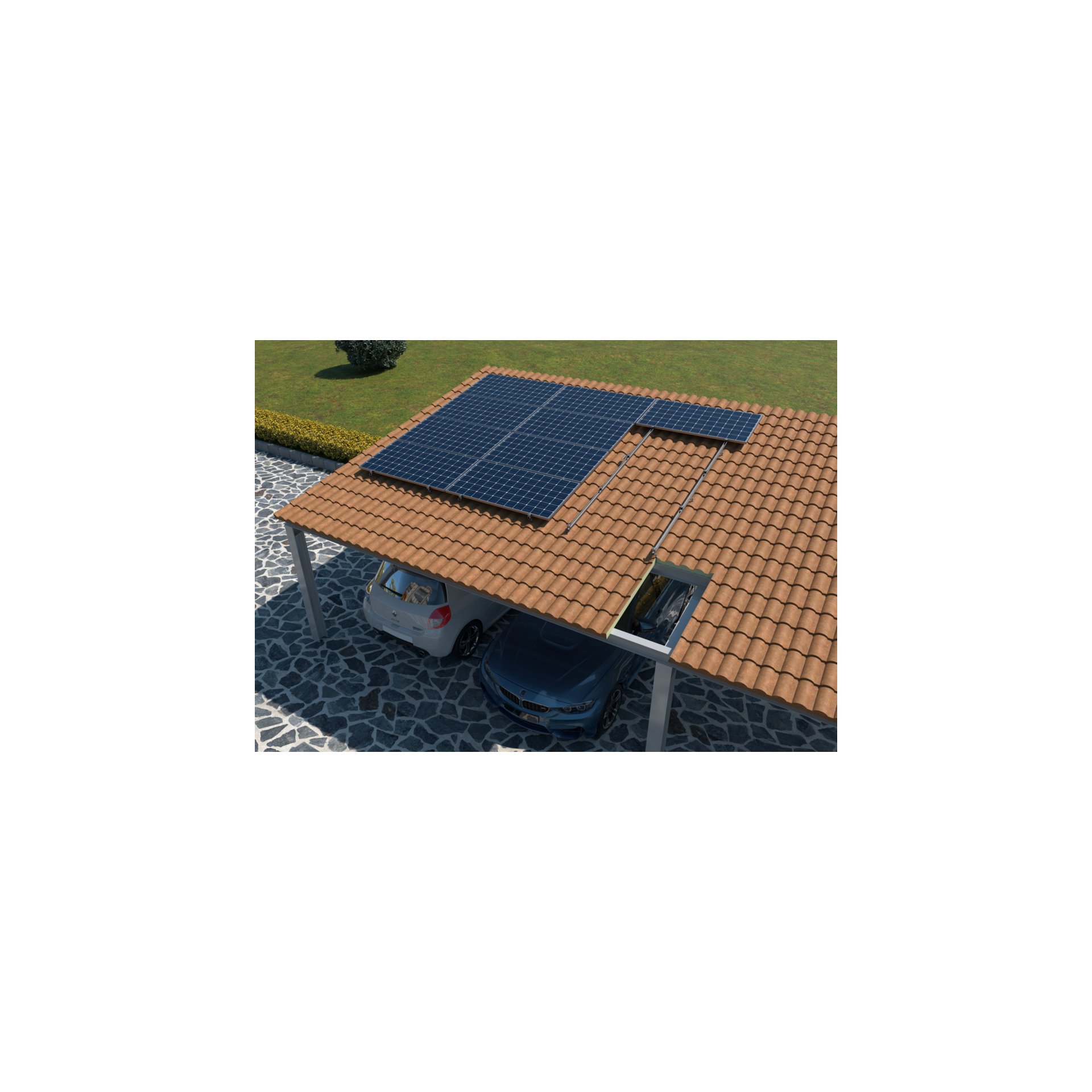 Kit d’assemblage pour l’installation d’une structure coplanaire pour panneaux solaires. Il permet de fixer les panneaux sur différents types de toits inclinés, au moyen d’accessoires de fixation réglables ou directement. Il est conçu selon le système de montage coplanaire SC-GPX. Il comprend les guides perforés GP-XS pour le montage continu, les pièces de raccordement EMPXS4115 avec écrous DIN6923 et vis DIN-6921, les clips de fixation rapide KFR-SC et les gabarits GM-A. Différents modèles sont disponibles, avec la possibilité d’installer 2 ou 3 plaques.