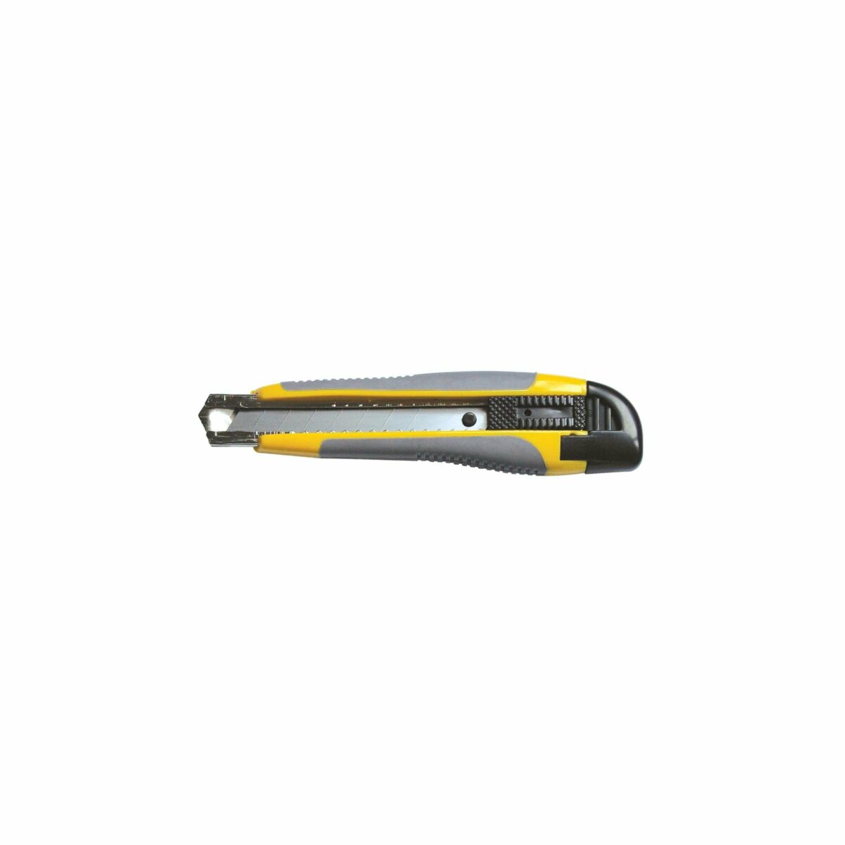 618 – Cutter poignée ergonomique bi-matière disponible en 2 couleurs jaune/gris ou bleu/gris . Lame 18mm avec arrêt automatique.
