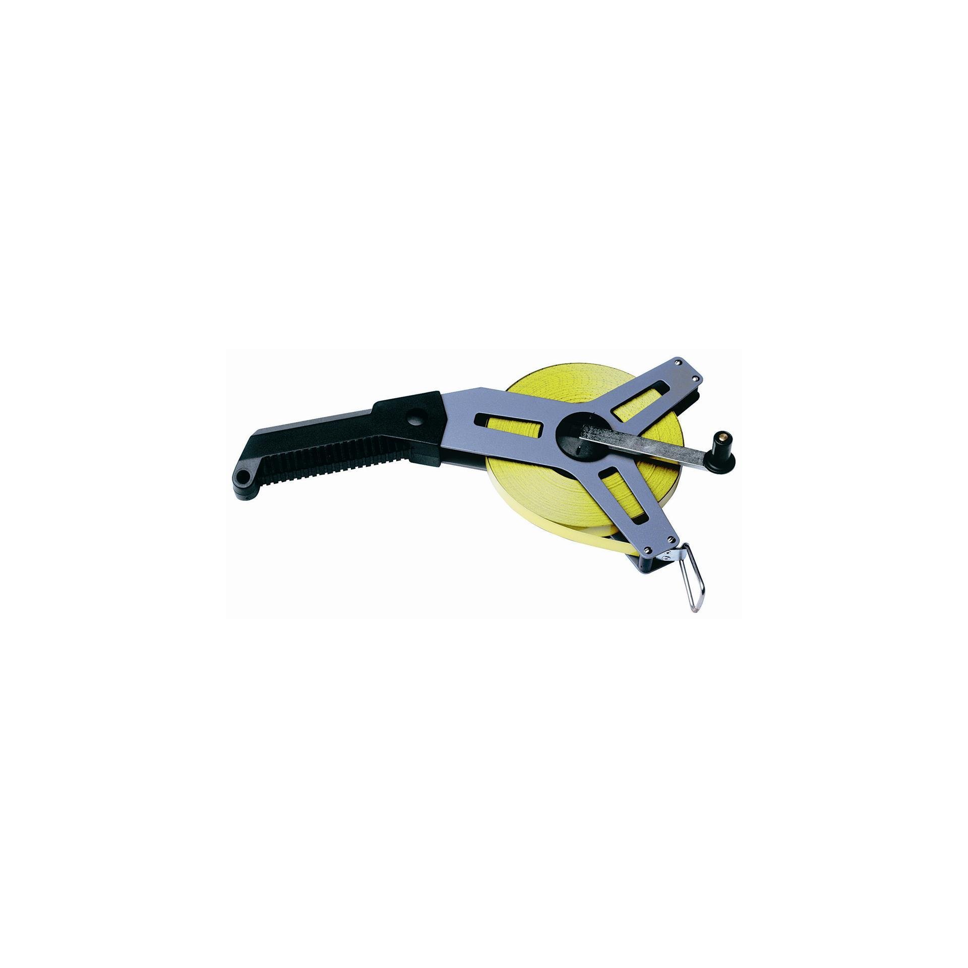 Réenroulement du ruban par manivelle repliable en métal.