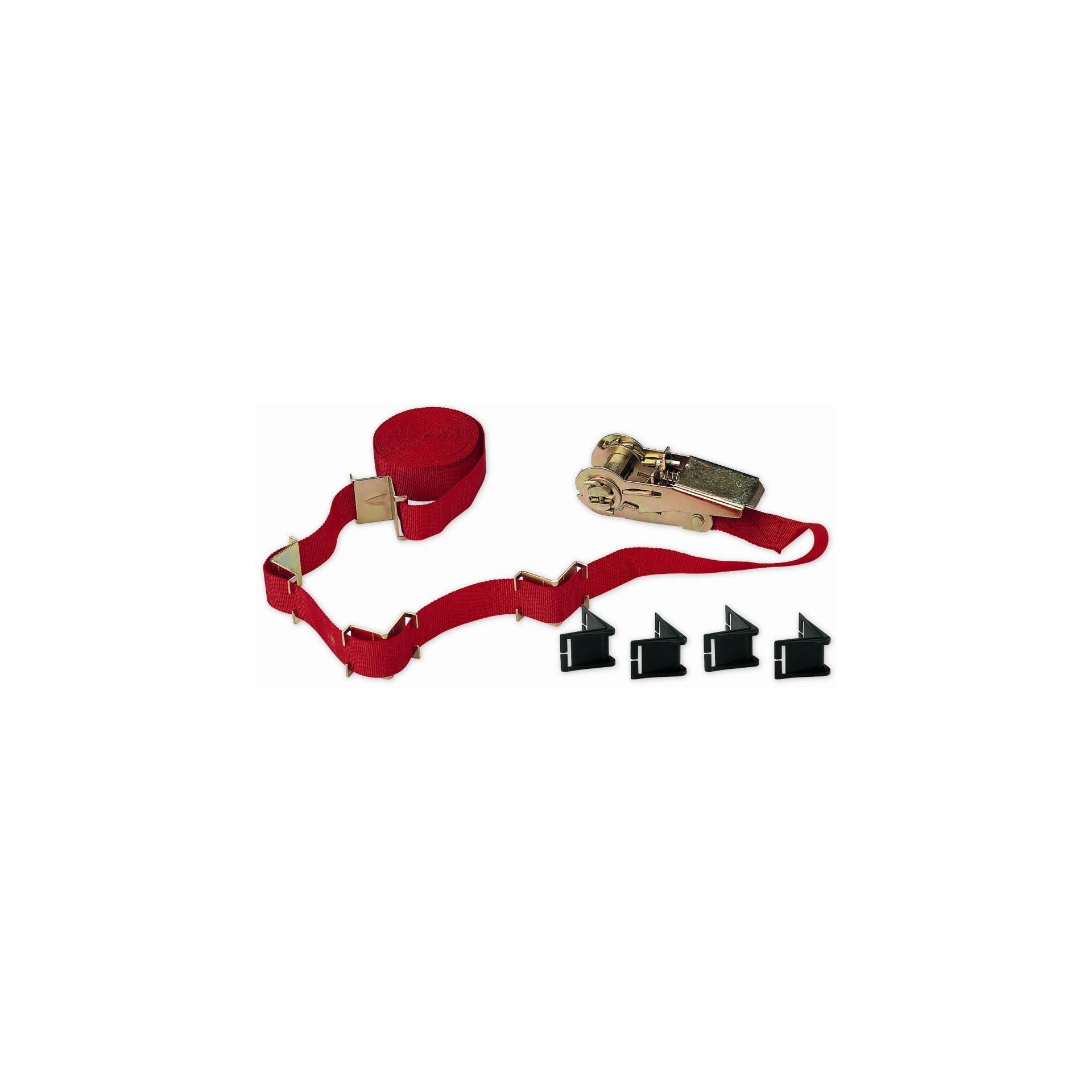 Presse à sangle à cliquet multiples usages, résistance 800 kg, avec 4 angles métalliques pour serrage carré ou rectangulaire,livrée avec 4 protecteurs d’angles en plastique, longueur de la sangle 5 m.