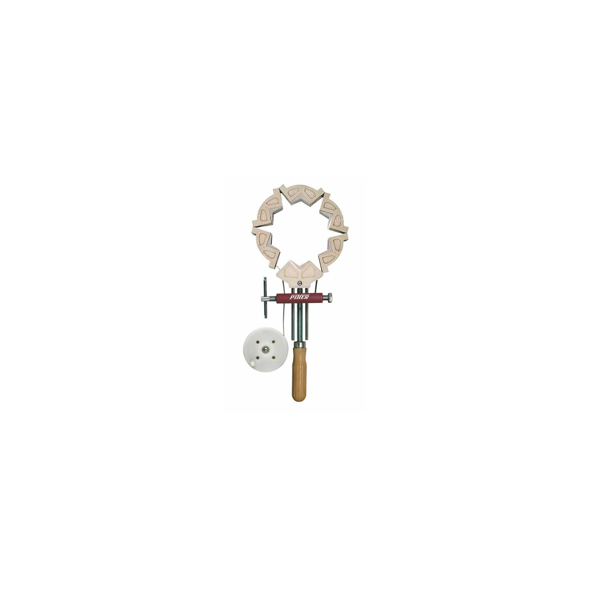 Presse en acier laminé, base en fonte, angle en nylon, permettant l’assemblage de forme hexagonale.