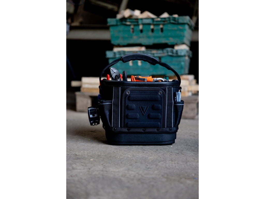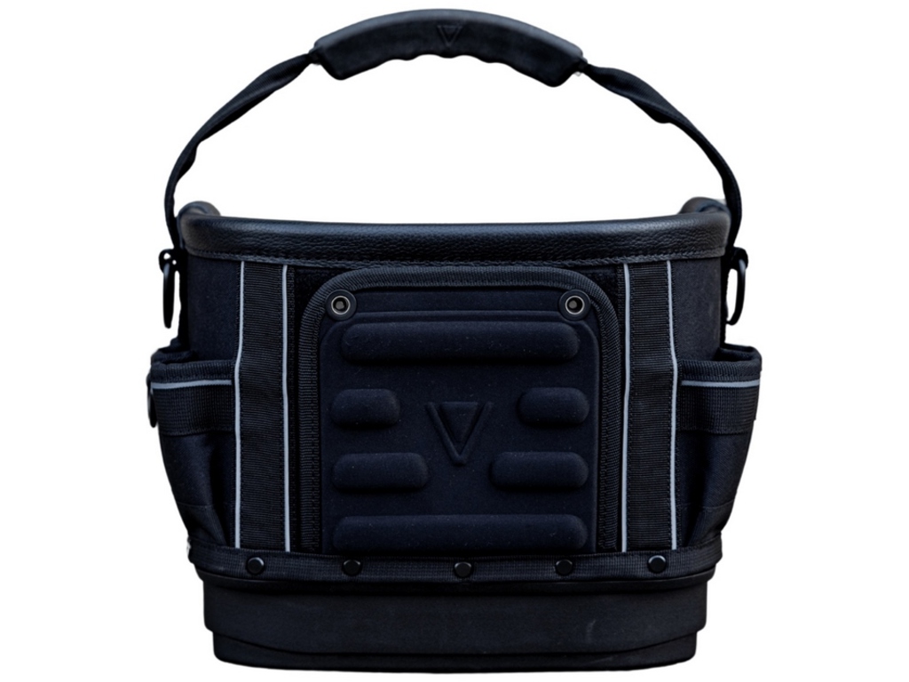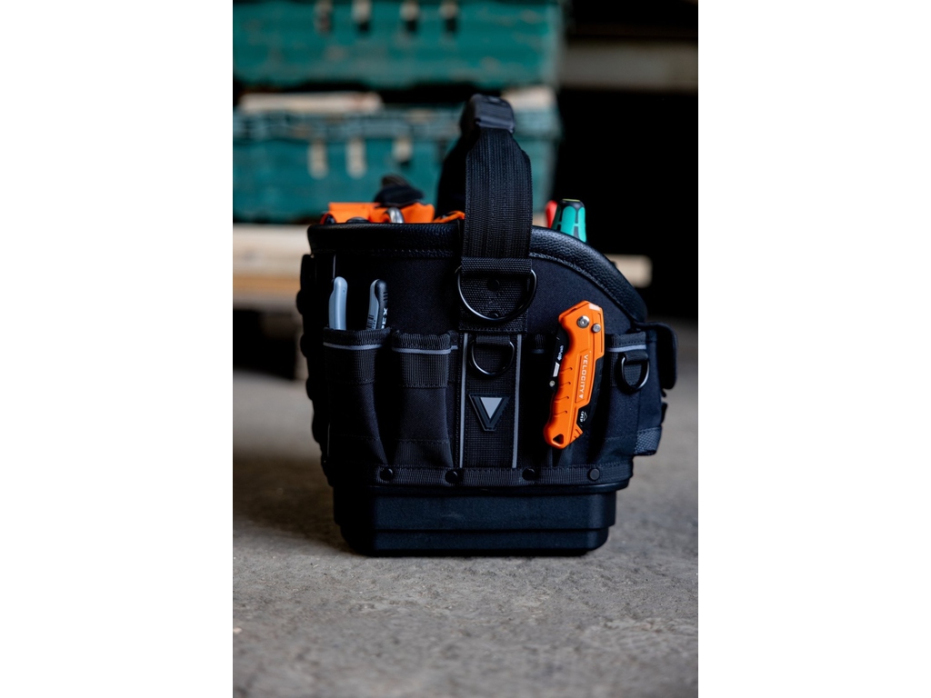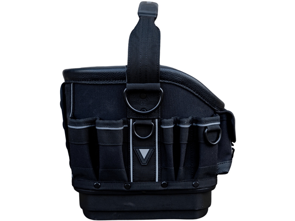 L'arrière du sac comprend des rangements verticaux dans les coins pour les outils plus volumineux, ainsi qu'une section centrale abritant un bac moulé amovible.