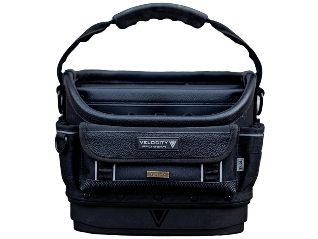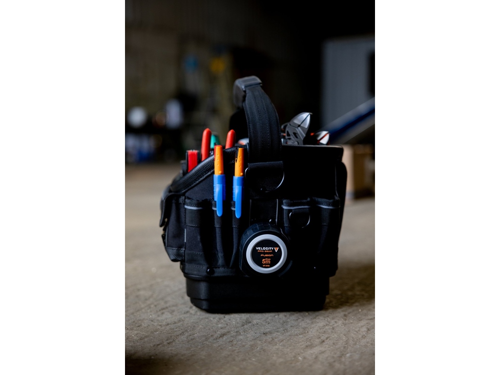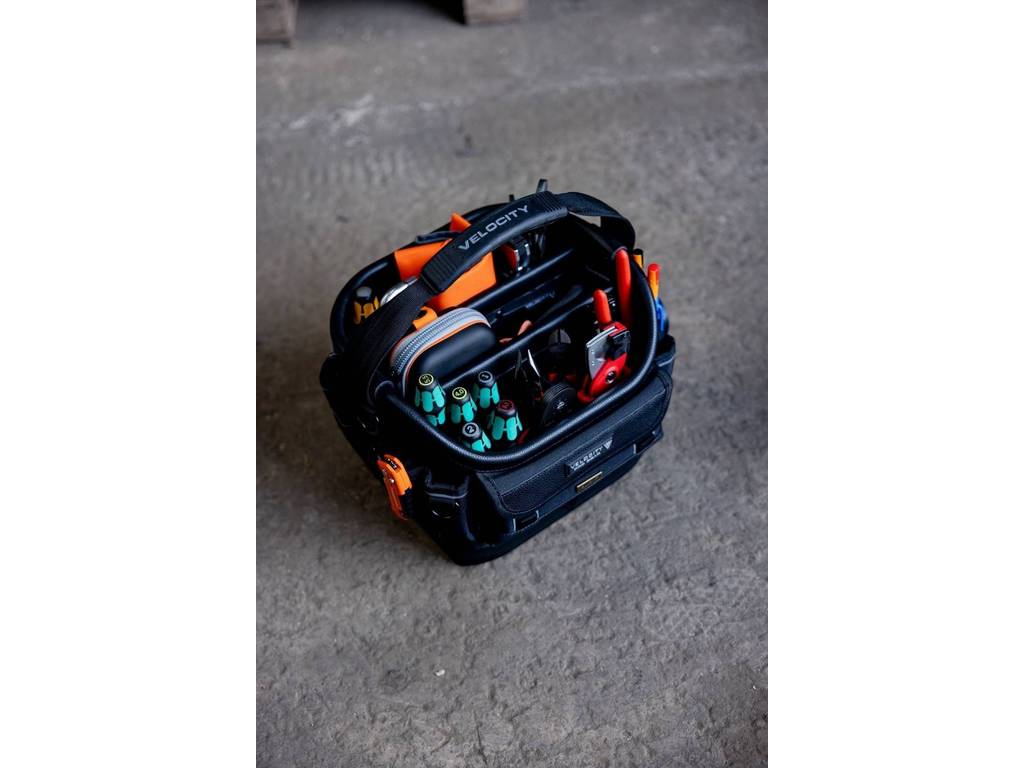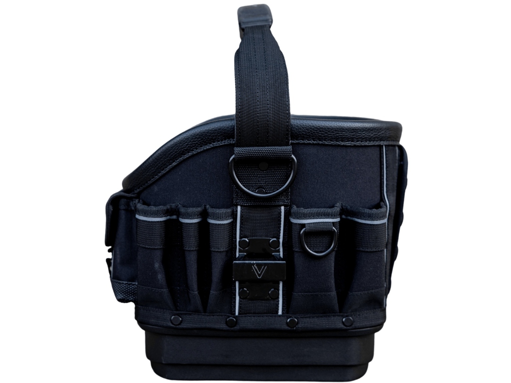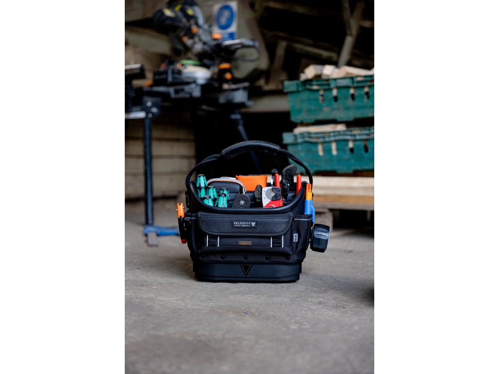 L'arrière du sac comprend des rangements verticaux dans les coins pour les outils plus volumineux, ainsi qu'une section centrale abritant un bac moulé amovible.